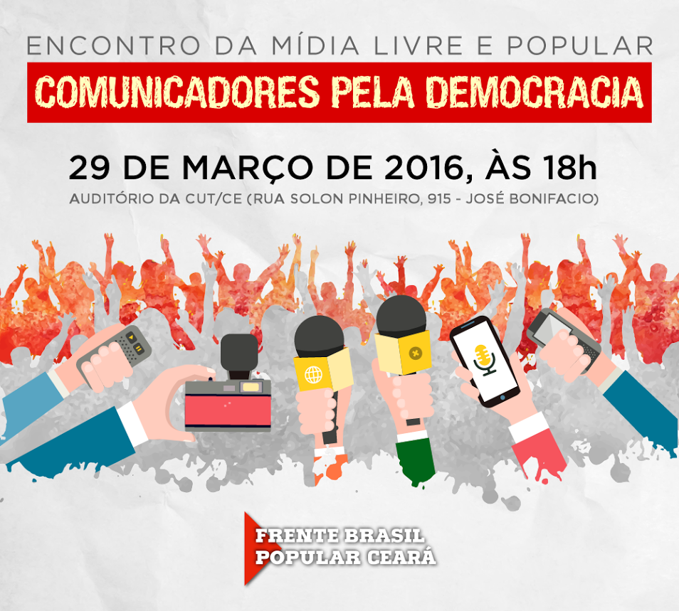 Jornalistas, publicitários, radialistas, comunicadores populares e ativistas digitais se reúnem na próxima terça-feira, 29 de março, no “Encontro da Mídia Livre e Popular – Comunicadores pela Democracia”. A atividade acontece a partir das 18 horas, na sede da Central Única dos Trabalhadores no Ceará (Rua Solon Pinheiro, 915 – José Bonifácio, Fortaleza).